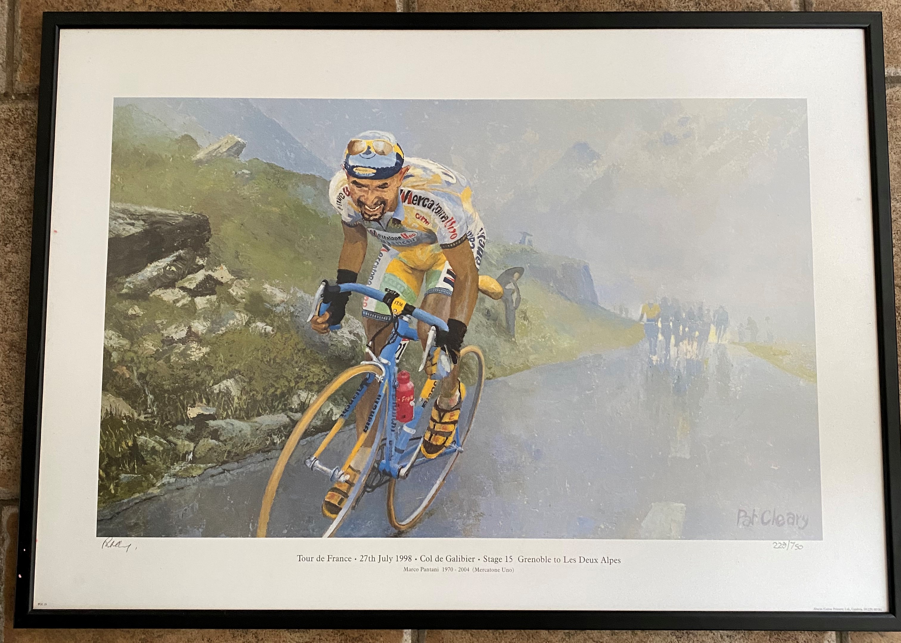 A quality framed, numbered and signed print by the artist Pat Cleary. The picture depicts Marco Pantani climbing the Col du Galibier on his way to winning the 1998 Tour de France.