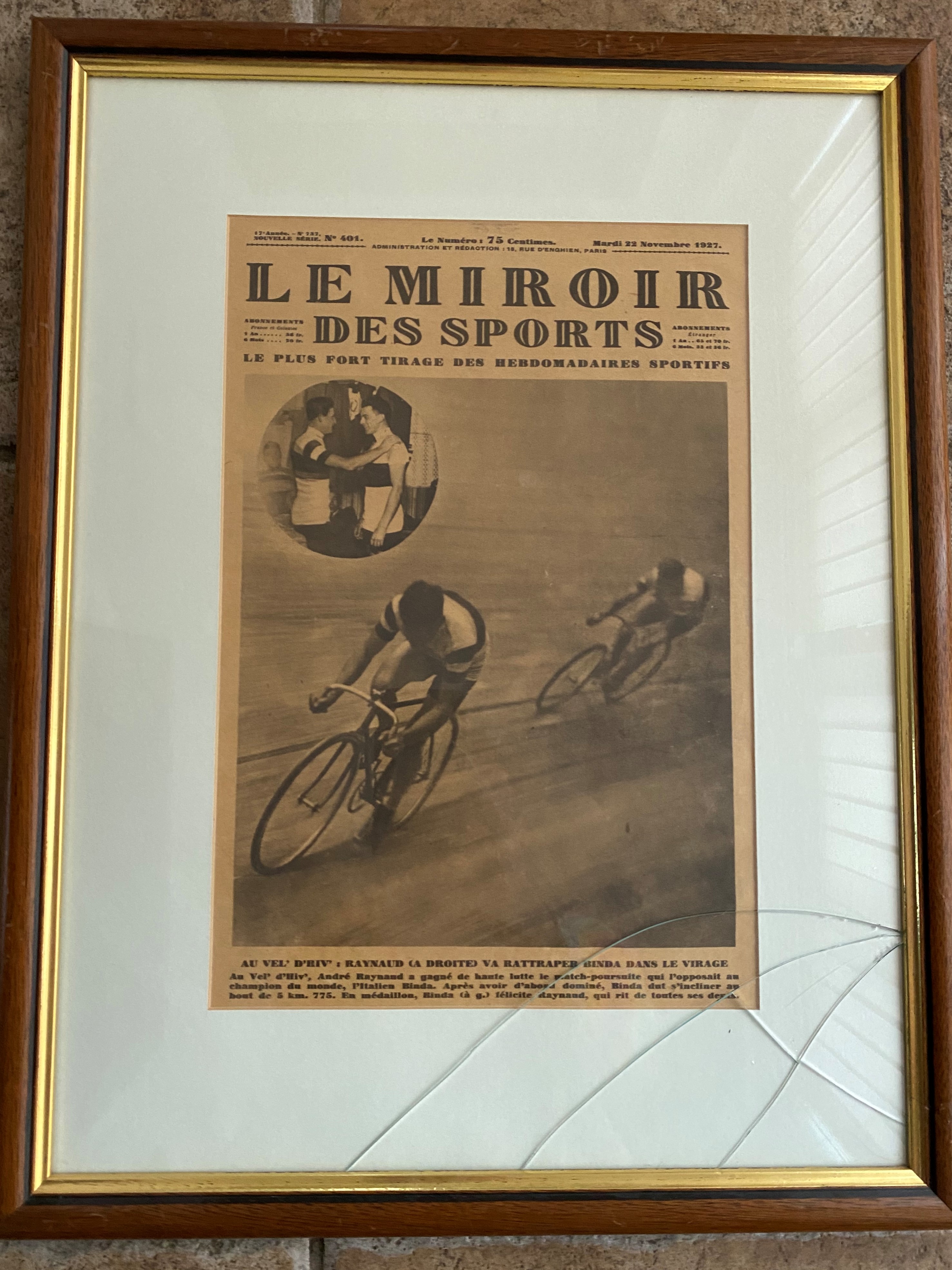 Framed original cover of the Miroir des Sports newspaper from November 22nd 1922, depicting action from the Velodrome d’Hiver in Paris. Very rare, a real collector’s piece.