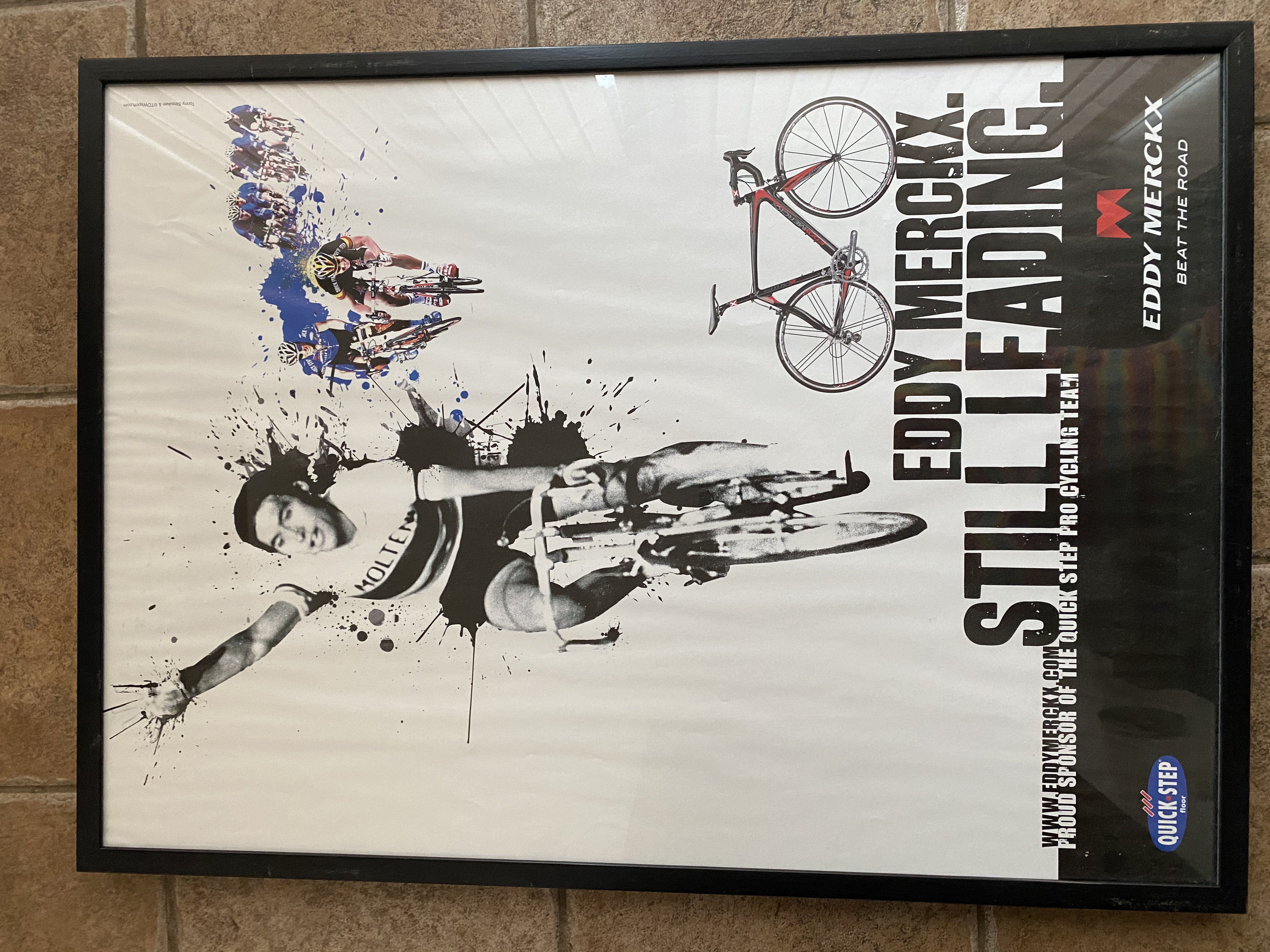 A framed and glass-fronted original Eddy Merckx Bikes advertising poster. This one advertises the fact that Eddy Merckx was the bike sponsor of the Quick Step professional cycling team.