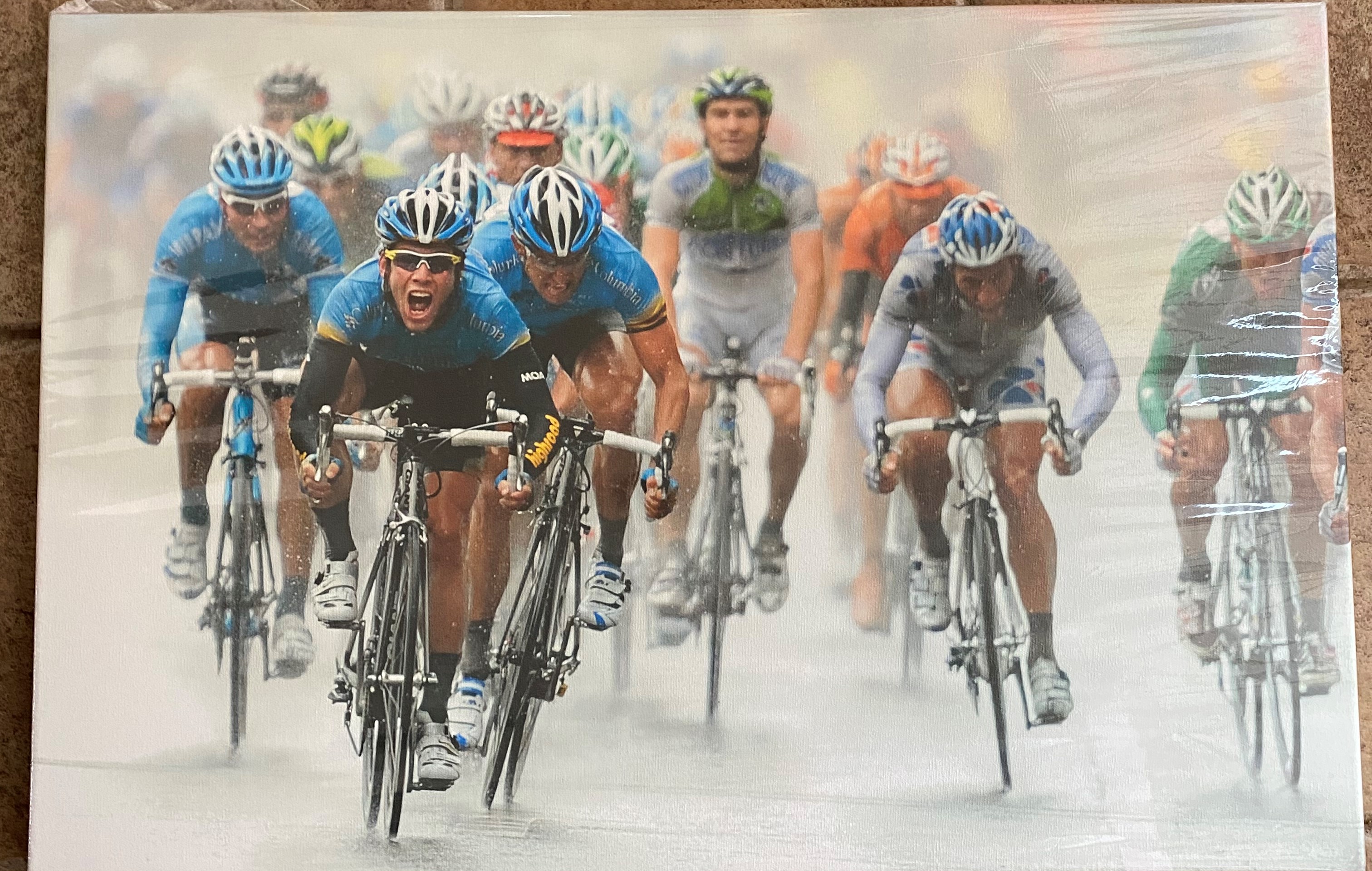 A photo of Mark Cavendish winning one of his first Tour de France stages, printed on canvas on a wooden frame. The frame is ready to mount on a wall.