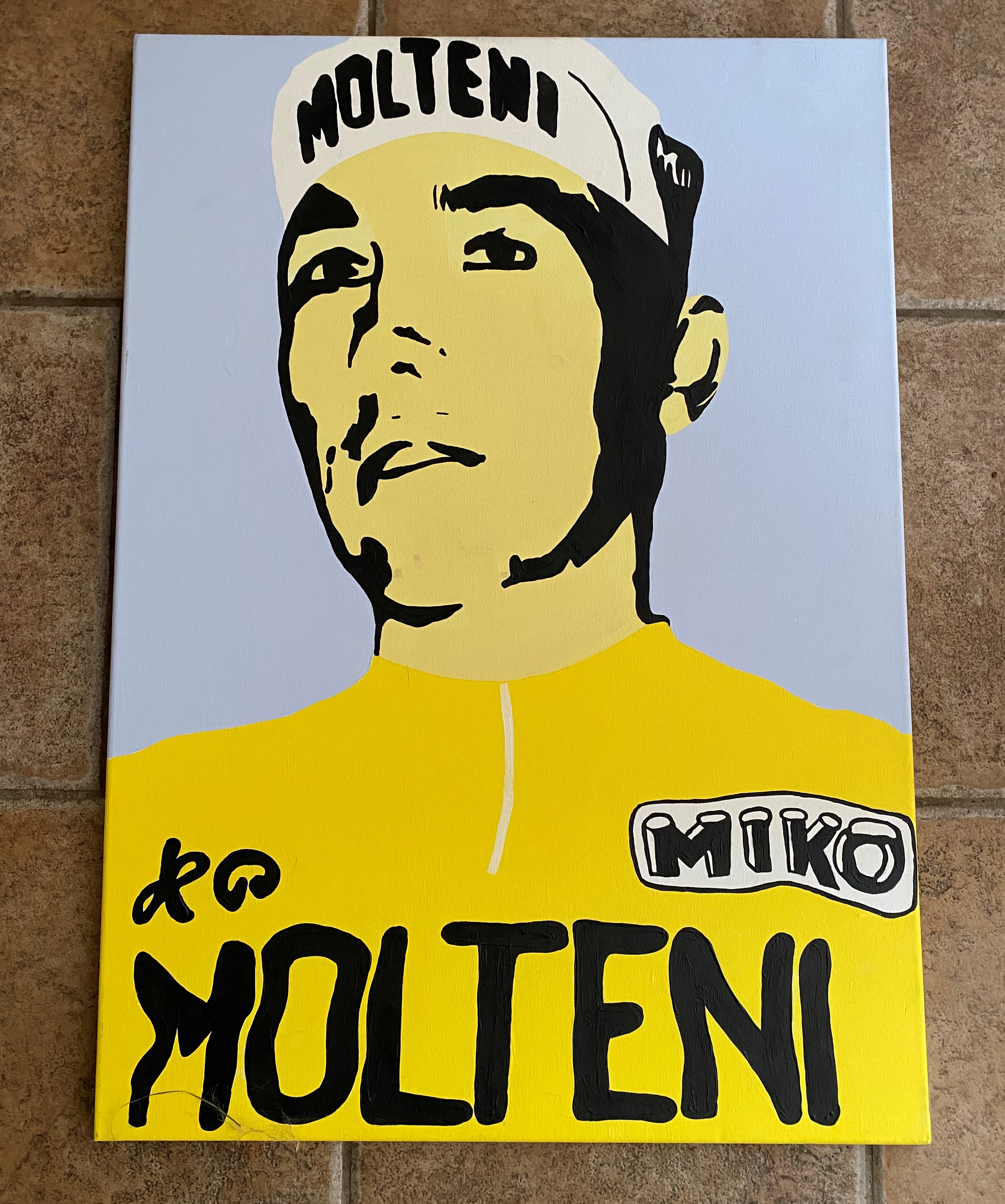 A painting of Eddy Merckx on canvas, signed by the artist. Merckx and the yellow jersey of the Tour de France are synonymous, the great Belgian having worn it for more often than any other cyclist in history. This would look magnificent hung on any wall.