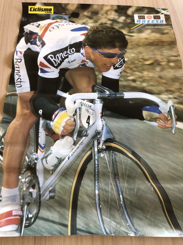 A classic 1990s poster by the Spanish magazine Ciclismo a Fondo. It features the 1988 Tour de France winner Pedro Delgado, and is sponsored by Razesa, the company that made the bikes Delgado and his Banesto team raced on.